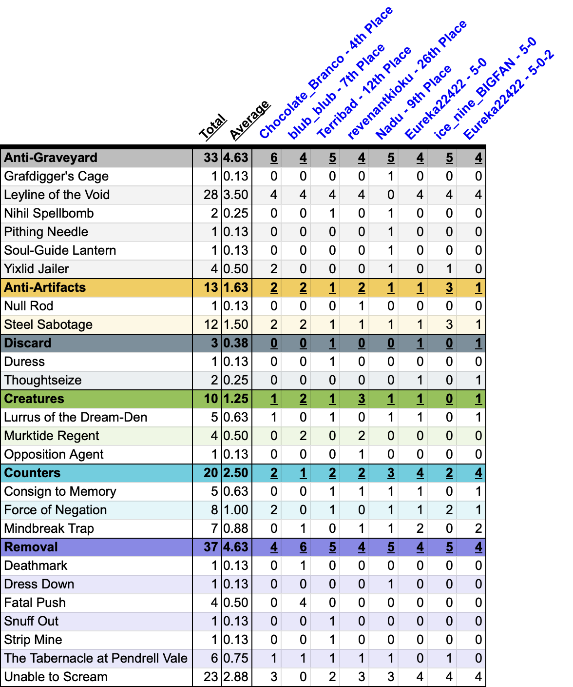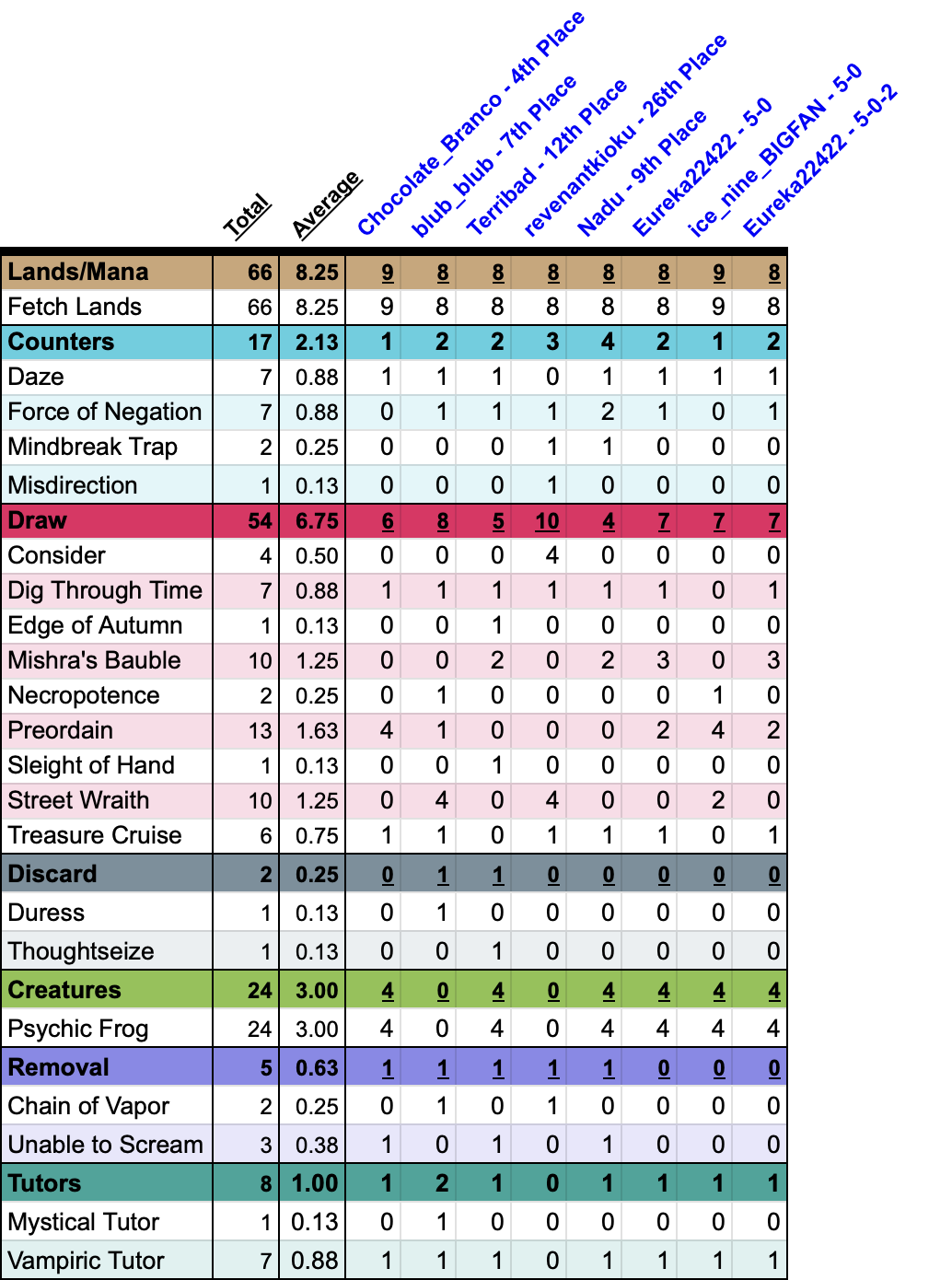 | // Counter (17) 7 Daze 7 Force of Negation 2 Mindbreak Trap 1 Misdirection // Creature (24) 24 Psychic Frog // Discard (2) 1 Duress 1 Thoughtseize // Draw (54) 4 Consider 7 Dig Through Time 1 Edge of Autumn 10 Mishra's Bauble 2 Necropotence 13 Preordain 1 Sleight of Hand 10 Street Wraith 6 Treasure Cruise | // LandsMana (2) 2 Fetch Lands // Removal (5) 2 Chain of Vapor 3 Unable to Scream // Tutor (8) 1 Mystical Tutor 7 Vampiric Tutor // AntiArtifact (5) 1 Null Rod 4 Steel Sabotage // AntiGraveyard (37) 1 Grafdigger's Cage 28 Leyline of the Void 2 Nihil Spellbomb 1 Pithing Needle 1 Soul-Guide Lantern 4 Yixlid Jailer // Counter (20) 5 Consign to Memory 8 Force of Negation 7 Mindbreak Trap // Creature (10) 5 Lurrus of the Dream-Den 4 Murktide Regent 1 Opposition Agent // Discard (3) 1 Duress 2 Thoughtseize // Removal (37) 1 Deathmark 1 Dress Down 4 Fatal Push 1 Snuff Out 1 Strip Mine 6 The Tabernacle at Pendrell Vale 23 Unable to Scream |