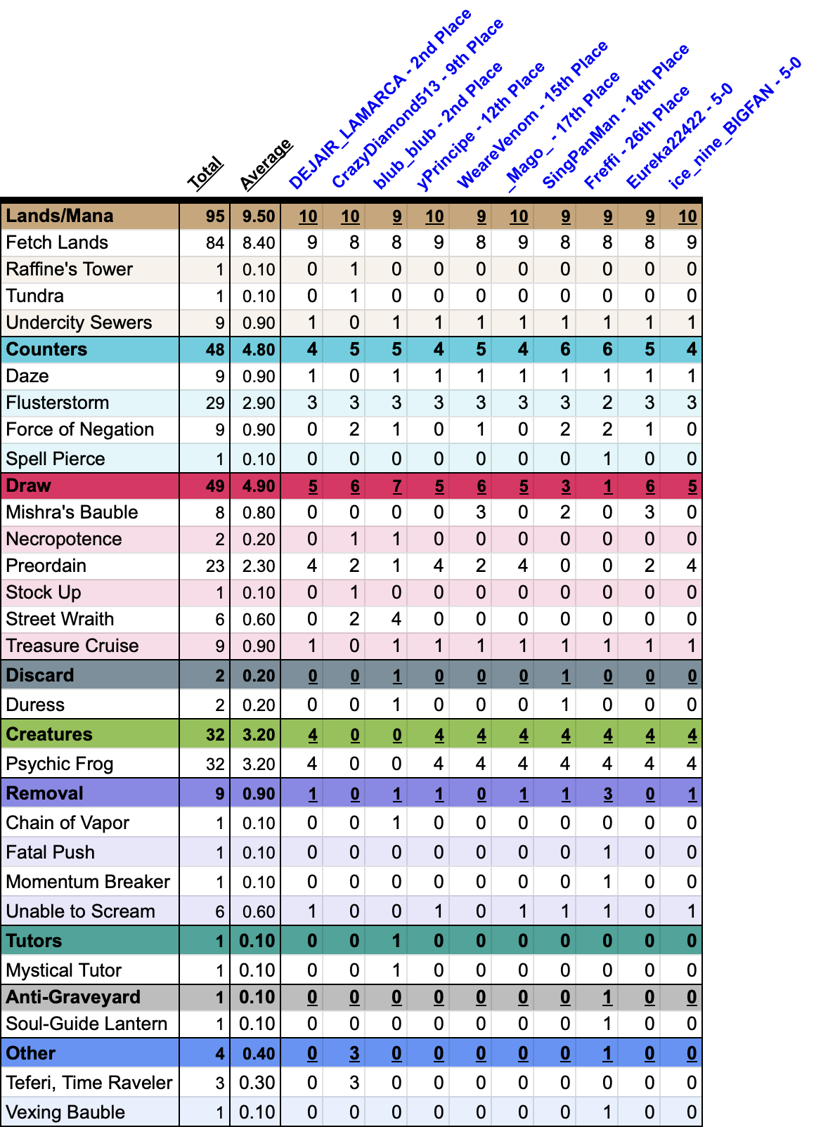 | Main (14) 1 Flusterstorm 2 Force of Negation 1 Necropotence 2 Preordain 1 Raffine's Tower 1 Stock Up 2 Street Wraith 3 Teferi, Time Raveler 1 Tundra | Sideboard (14) 1 Consign to Memory 1 Daze 1 Dress Down 2 Duress 1 Mystical Dispute 1 Null Rod 2 Overencumbered 2 Ravenous Trap 3 Unable to Scream |