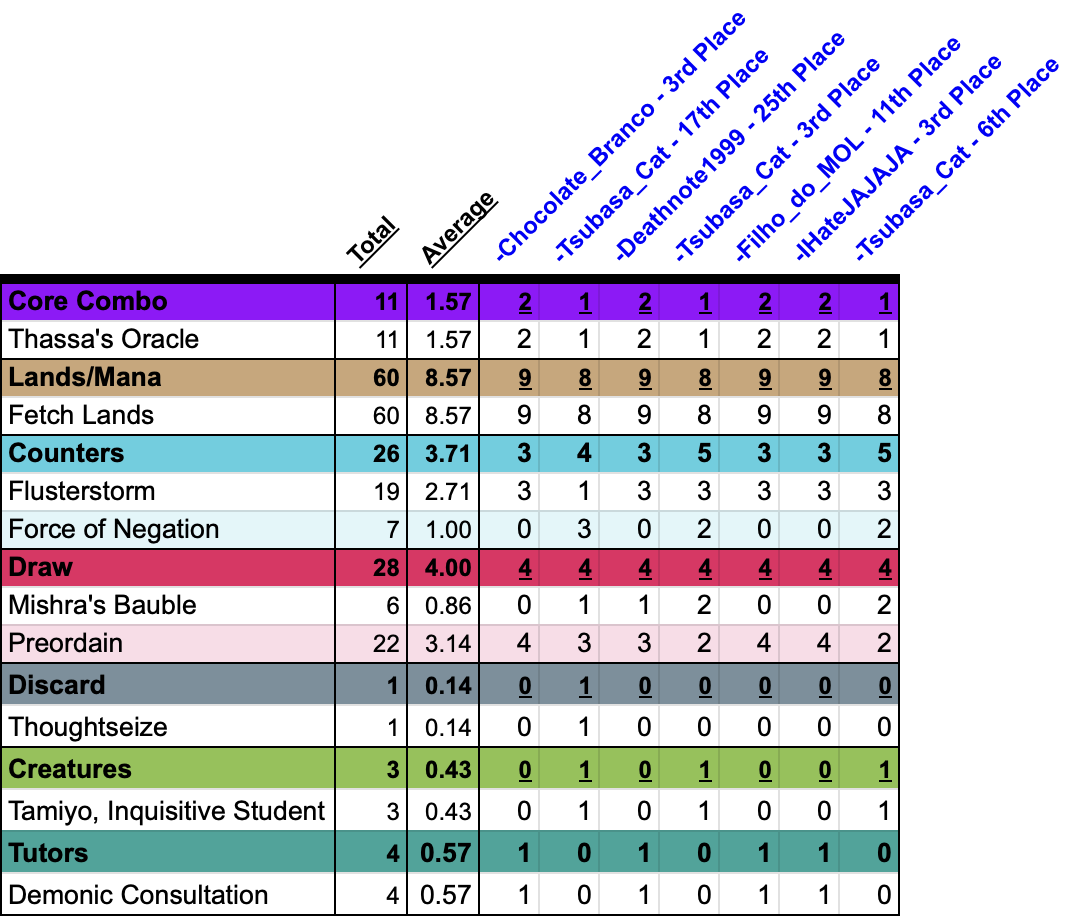 | Main (7) 1 Demonic Consultation 1 Fetch Lands 2 Flusterstorm 2 Preordain 1 Thassa's Oracle | Sideboard (6) 2 Force of Negation 1 Steel Sabotage 1 The Tabernacle at Pendrell Vale 2 Yixlid Jailer |