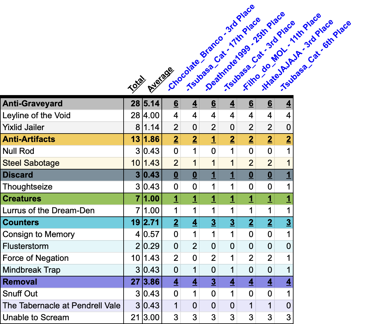 | Main (7) 3 Force of Negation 1 Mishra's Bauble 1 Preordain 1 Tamiyo, Inquisitive Student 1 Thoughtseize | Sideboard (6) 1 Consign to Memory 2 Flusterstorm 1 Mindbreak Trap 1 Null Rod 1 Snuff Out |