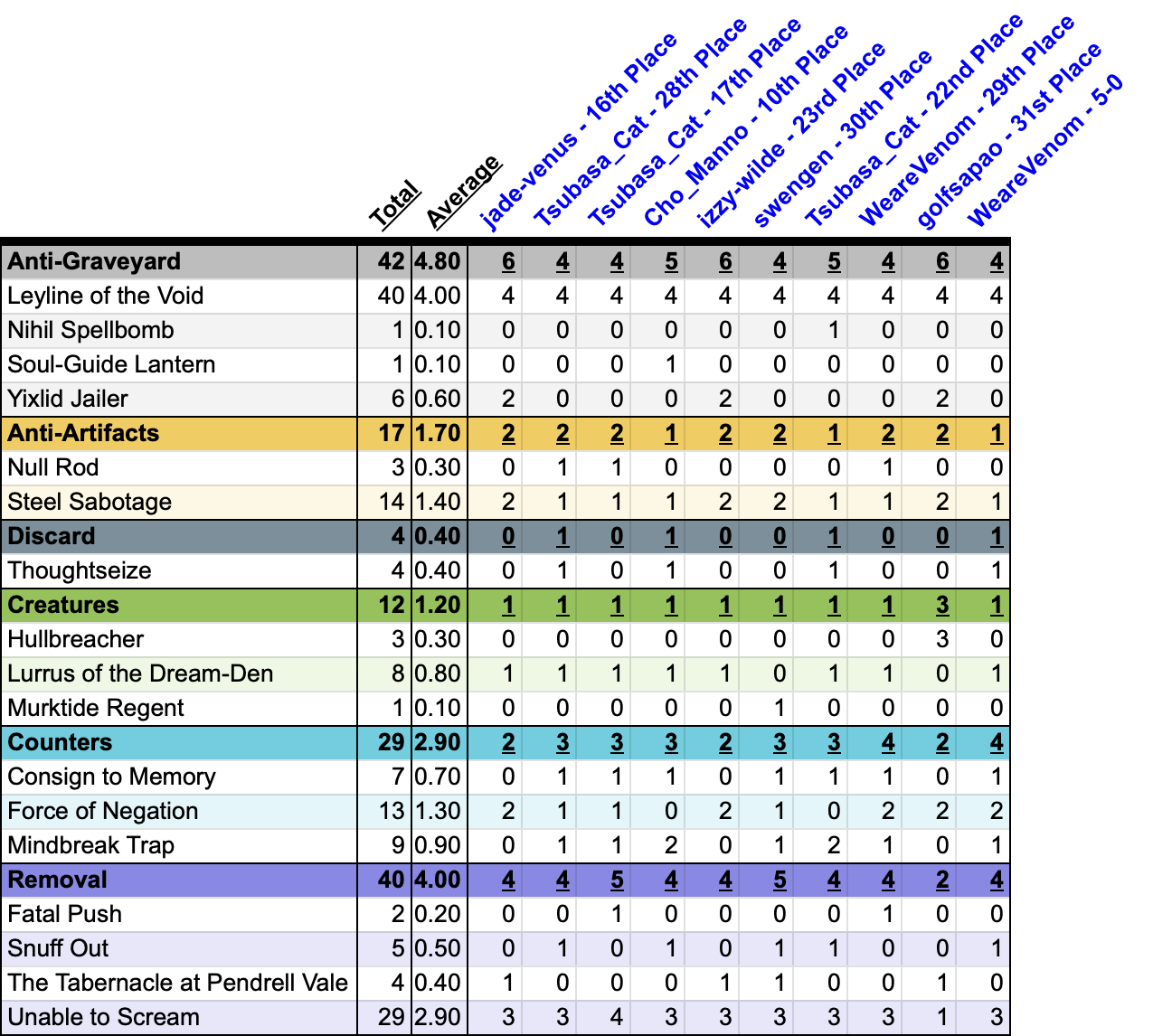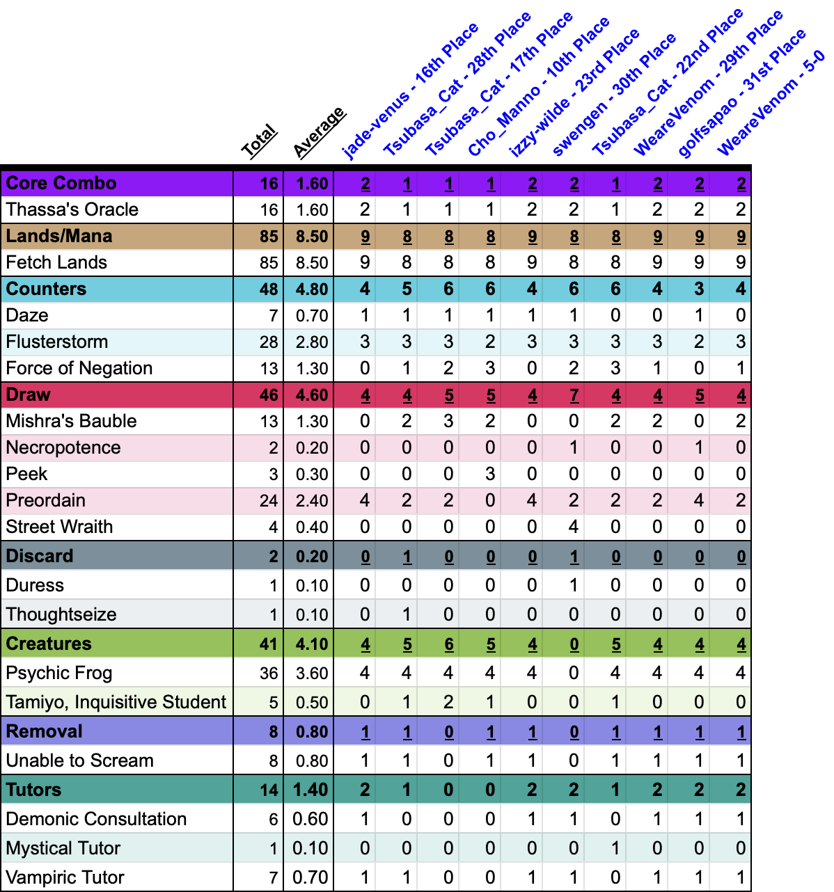 | // CoreCombo (6) 6 Thassa's Oracle // Counter (28) 7 Daze 8 Flusterstorm 13 Force of Negation // Creature (41) 36 Psychic Frog 5 Tamiyo, Inquisitive Student // Discard (2) 1 Duress 1 Thoughtseize // Draw (46) 13 Mishra's Bauble 2 Necropotence 3 Peek 24 Preordain 4 Street Wraith | // LandsMana (5) 5 Fetch Lands // Removal (8) 8 Unable to Scream // Tutor (14) 6 Demonic Consultation 1 Mystical Tutor 7 Vampiric Tutor // AntiArtifact (7) 3 Null Rod 4 Steel Sabotage // AntiGraveyard (8) 1 Nihil Spellbomb 1 Soul-Guide Lantern 6 Yixlid Jailer // Counter (29) 7 Consign to Memory 13 Force of Negation 9 Mindbreak Trap // Creature (12) 3 Hullbreacher 8 Lurrus of the Dream-Den 1 Murktide Regent // Discard (4) 4 Thoughtseize // Removal (30) 2 Fatal Push 5 Snuff Out 4 The Tabernacle at Pendrell Vale 19 Unable to Scream |